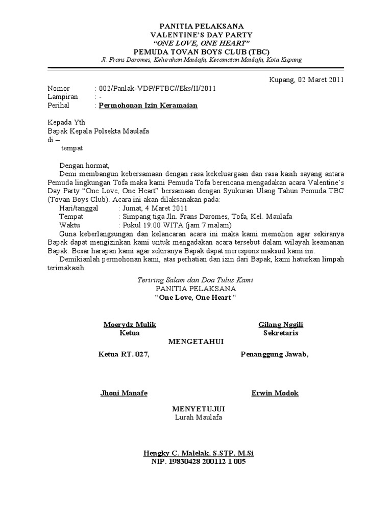 Surat Izin Keramaian Kepolisian Perpisahan from imgv2-2-f.scribdassets.com Sharing contoh surat izin keramaian guys.mana tau ada yang bingung gimana cara buat surat izin keramaian berhubung minta izin ke kantor polisi. Surat izin keramaian adalah surat yang dibuat oleh pihak perseorangan maupun kelompok/lembaga/instansi resmi yang berisikan permohonan izin untuk mengadakan suatu kegiatan yang ditujukan kepada kepolisian. Contoh surat izin mengadakan keramaian. Surat an izin pemberitahuan keramaian. Sebagai karyawan atau pekerja yang baik tentu harus memberikan contoh surat izin tidak masuk kerja ketika kita berhalangan untuk bekerja seperti biasanya. Foto kopi kartu tanda penduduk ( ktp ) orang yang mempunyai acara atau pihak yang bertanggung. Minggu/7 juni 2015 waktu : Sebelum ke pembahasan inti mengenai contoh surat izin sakit dengan berbagai kategori, alangkah baiknya kita ketahui penulisan surat izin yang benar dan sesuai.